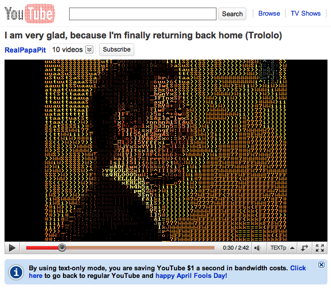 Watch YouTube in ASCII mode, save bandwidth Published 26 March 2011 at 656 × 570 in Watch YouTube in ASCII mode, save bandwidth Share & enjoy: Click to share on Reddit (Opens in new window) Reddit Tweet Click to email a link to a friend (Opens in new window) Email MoreShare on TumblrLike Loading...