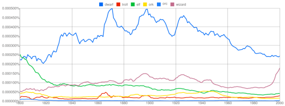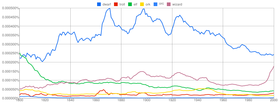 I was surprised to see ‘ray gun’ and ‘martian’ are still getting more popular use. (In fact, ‘Martian’ – uppercase ‘M’ – dwarfs these other terms). Speaking of martians and dwarves…