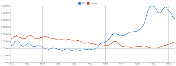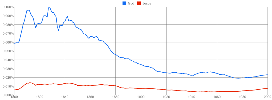 Note the decline of the elves and the sudden renewed interest in wizards. And speaking of fantasy creatures, it’s striking to see the decline of interest in God and Jesus, though there does seem to be a small uptake over the last few decades.