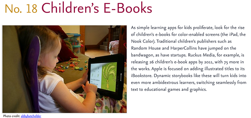 Predictions for 2011 – 18: Kids E-books Published 26 March 2011 at 800 × 378 in Predictions for 2011 (via jwtintelligence.com) Share & enjoy: Click to share on Reddit (Opens in new window) Reddit Tweet Click to email a link to a friend (Opens in new window) Email MoreShare on TumblrLike Loading...