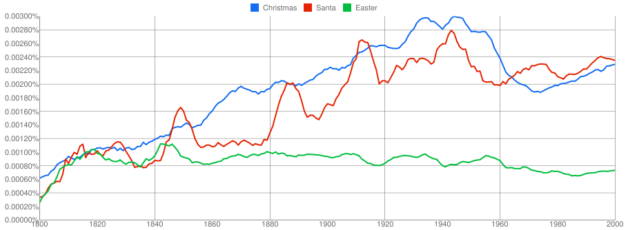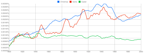It’s curious how ‘Santa’ seems to have regular spikes of interest every few decades (1850, 1910, 1950, 1970-ish). Boom periods?