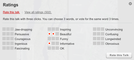 TED talks video rating system Published 11 September 2011 at 509 × 228 in An idea for more meaningful ‘like’ buttons Share & enjoy: Click to share on Reddit (Opens in new window) Reddit Tweet Click to email a link to a friend (Opens in new window) Email MoreShare on TumblrLike Loading...