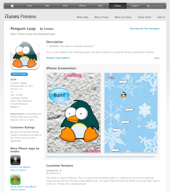 This game is a waist of 99cents. This is a crap version of doodle jump! If u r looking for that kind of a game go ahead and pay the extra 88 cents to get doodle jump. This game made me throw my iPhone at the wall. Now I have a crack on it. Thanks alot u stupid penguin