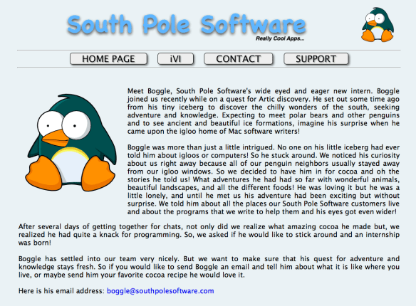 Meet Boggle, South Pole Software’s wide eyed and eager new intern. Boggle joined us recently while on a quest for Artic discovery. He set out some time ago from his tiny iceberg to discover the chilly wonders of the south, seeking adventure and knowledge. Expecting to meet polar bears and other penguins and to see ancient and beautiful ice formations, imagine his surprise when he came upon the igloo home of Mac software writers!