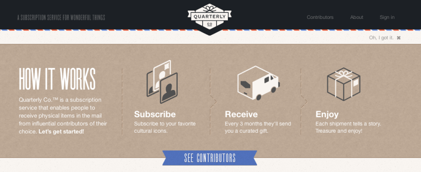 Quarterly Co. Published 19 September 2011 at 1114 × 455 in Quarterly Co. Quarterly Co. – a subscription service that enables people to receive physical items in the mail from influential contributors of their choice. Share & enjoy: Share on Reddit (Opens in new window) Reddit Tweet Email a link to a friend (Opens in new window) Email MoreShare on TumblrLike Loading...