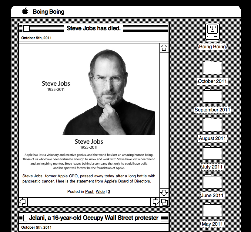 Boing Boing Apple theme Published 6 October 2011 at 828 × 764 in Steve Jobs, 1955 – 2011 Boing Boing Apple theme Boing Boing were very quick to adopt this retro Apple WordPress theme. Share & enjoy: Click to share on Reddit (Opens in new window) Reddit Tweet Click to email a link to a friend (Opens in new window) Email MoreShare on TumblrLike Loading...