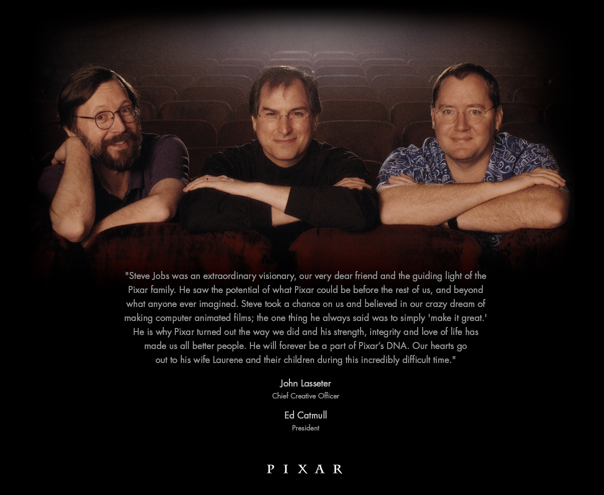 Pixar’s Steve Jobs tribute page Published 7 October 2011 at 1206 × 990 in Steve Jobs, 1955 – 2011 Share & enjoy: Click to share on Reddit (Opens in new window) Reddit Tweet Click to email a link to a friend (Opens in new window) Email MoreShare on TumblrLike Loading...