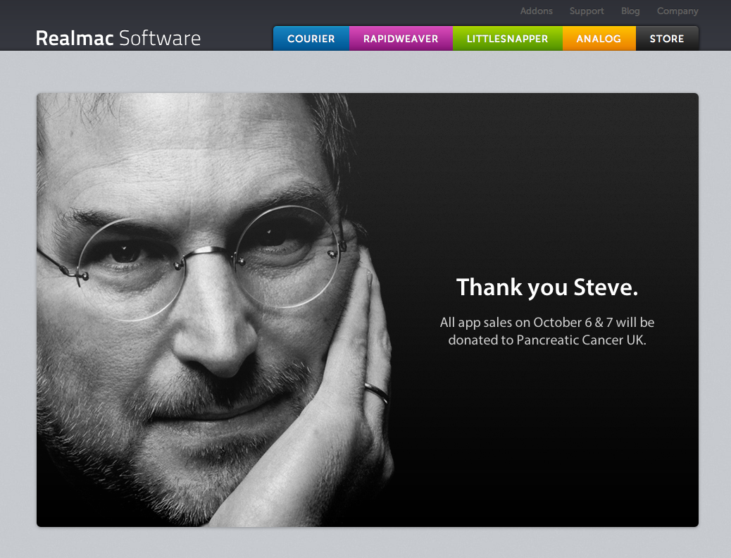 Realmac Software tribute to Steve Jobs Published 6 October 2011 at 1038 × 792 in Steve Jobs, 1955 – 2011 realmacsoftware.com Share & enjoy: Click to share on Reddit (Opens in new window) Reddit Tweet Click to email a link to a friend (Opens in new window) Email MoreShare on TumblrLike Loading...