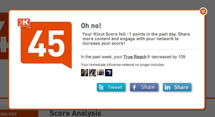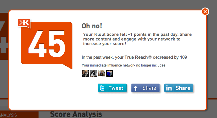 Klout: Oh no! Published 31 October 2011 at 749 × 408 in Why Klout thinks you are ‘special’ Share & enjoy: Click to share on Reddit (Opens in new window) Reddit Tweet Click to email a link to a friend (Opens in new window) Email MoreShare on TumblrLike Loading...