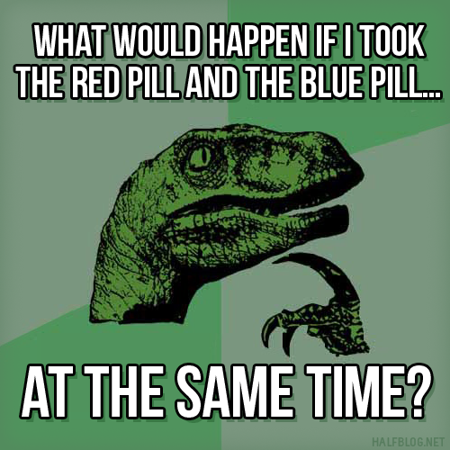 Philosoraptor on The Matrix Published 10 November 2011 at 500 × 500 in The wisdom of Philosoraptor Share & enjoy: Click to share on Reddit (Opens in new window) Reddit Tweet Click to email a link to a friend (Opens in new window) Email MoreShare on TumblrLike Loading...