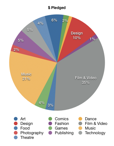 Of all the money pledged to Kickstarter projects in 2011 (not necessarily pledged to successful projects), this shows what percentages were put into each category. So 35% of all pledges were towards film and video projects.