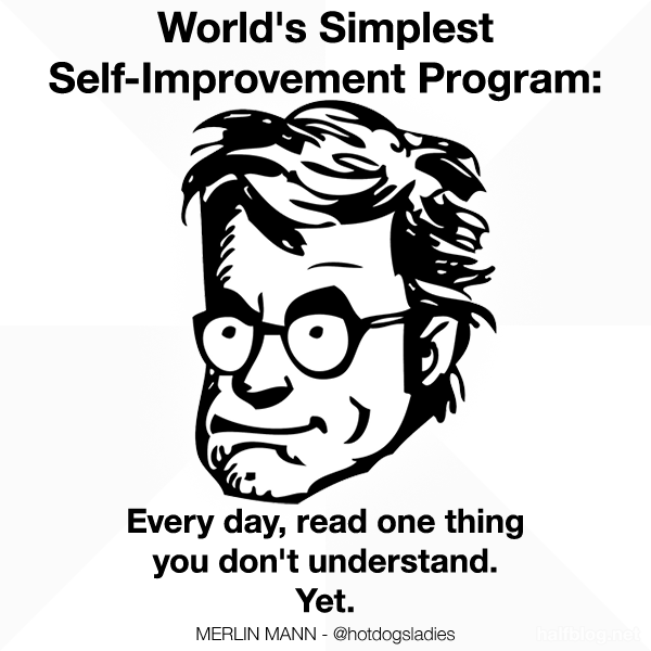 World’s Simplest Self-Improvement Program: Published 22 February 2012 at 600 × 600 in Merlin Mann meme Every day read one thing you don’t understand. Yet. Share & enjoy: Click to share on Reddit (Opens in new window) Reddit Tweet Click to email a link to a friend (Opens in new window) Email MoreShare on TumblrLike Loading...