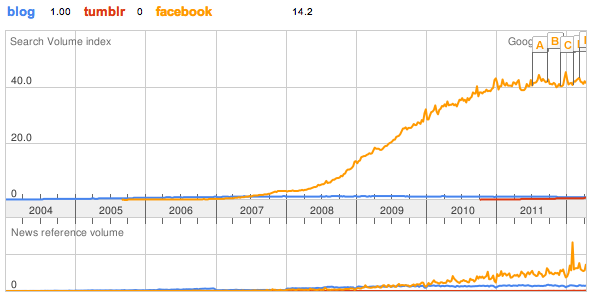 Google Trends: blog, tumblr, facebook Published 16 April 2012 at 592 × 296 in Ablogalypse (via Google Trends) Share & enjoy: Click to share on Reddit (Opens in new window) Reddit Tweet Click to email a link to a friend (Opens in new window) Email MoreShare on TumblrLike Loading...