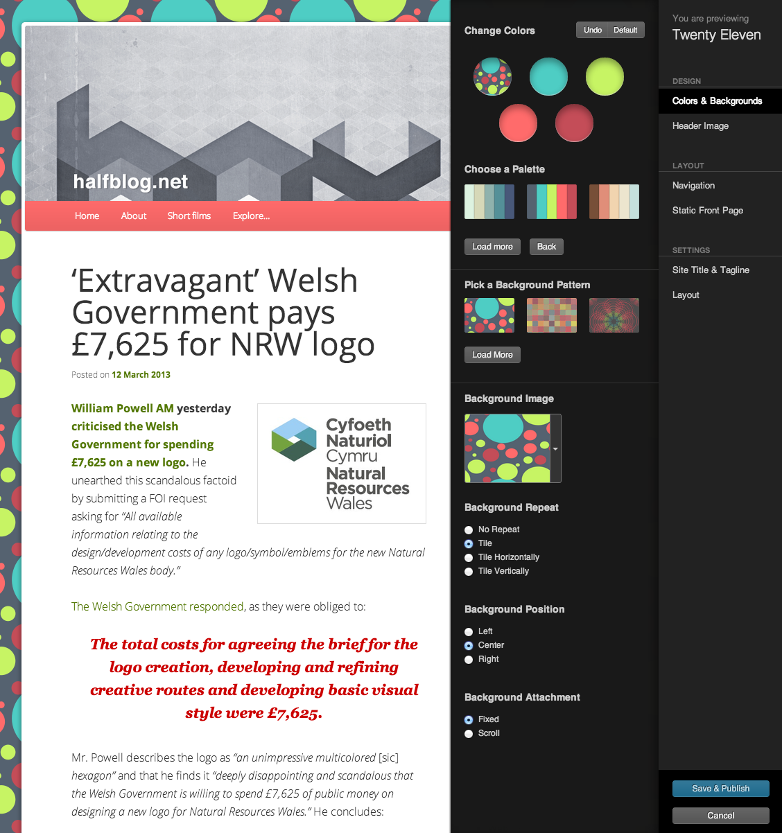 Custom Design: Colours Published 13 March 2013 at 1128 × 1202 in Some custom CSS to pimp your WordPress blog Radically overhaul your blog with smart colour palettes, complementary background images and complete control without touching a line of CSS. Share & enjoy: Click to share on Reddit (Opens in new window) Reddit Tweet Click to email a link to a friend (Opens in new window) Email MoreShare on TumblrLike Loading...