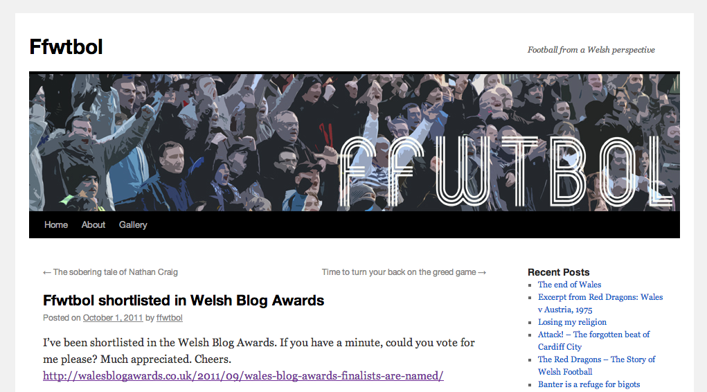 Ffwtbol Published 5 October 2012 at 1021 × 566 in Wales Blog Awards Ffwtbol: Winner of the Wales Blog Awards, 2011 Ffwtbol Share & enjoy: Click to share on Reddit (Opens in new window) Reddit Tweet Click to email a link to a friend (Opens in new window) Email MoreShare on TumblrLike Loading...